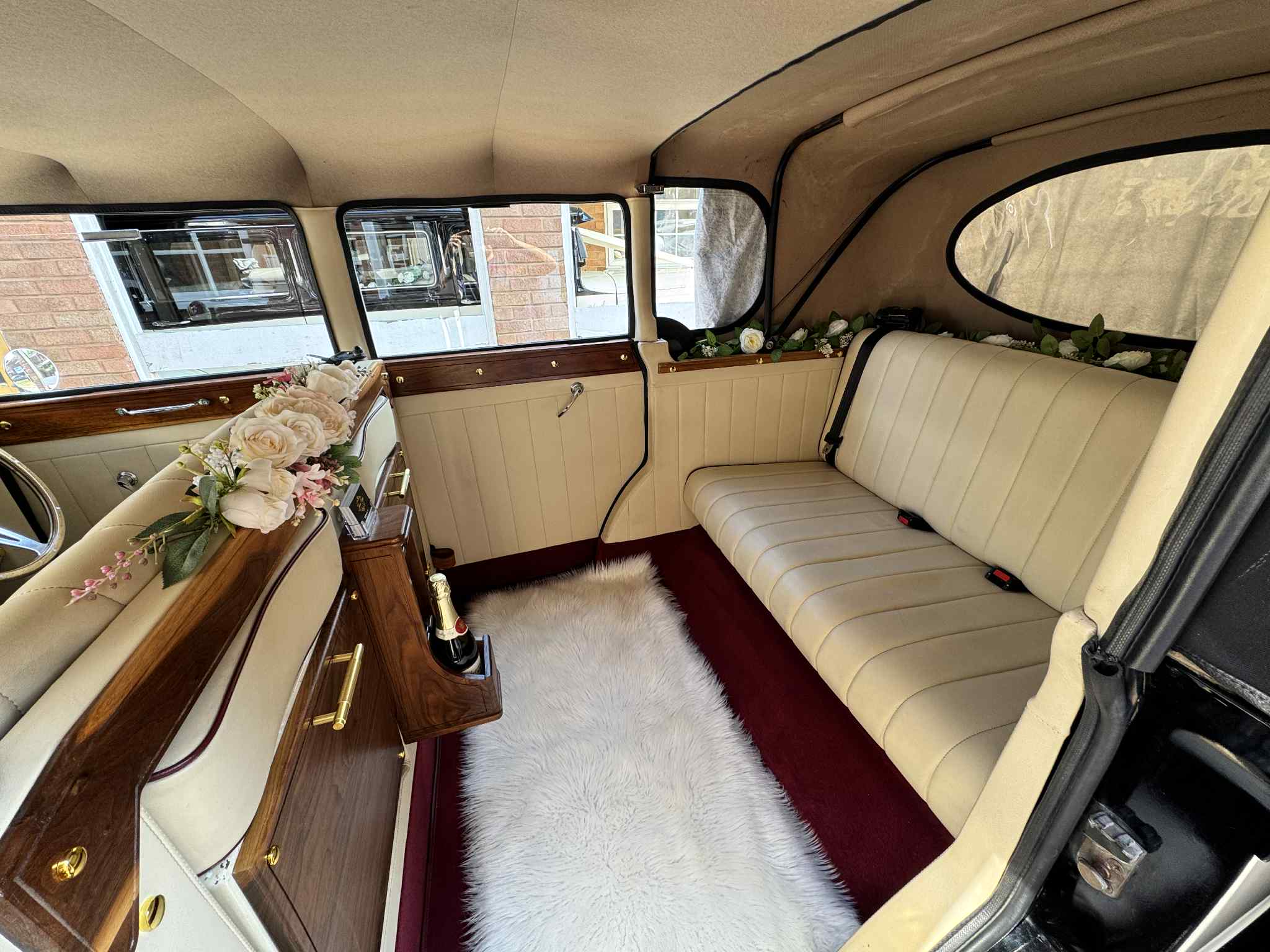 Our Bramwith Landaulette “Hazel” can accommodate up to 6 passengers plus chauffeur. This makes the Bramwith the perfect bridesmaids car as well as the main bridal car, hazel matched perfectly with our Beauford Belinda. Finished in old English white with full cream leather spacious interior this car is truly outstanding! Being the landaulette, this means the rear roof section drops down making for perfect photo opportunities!